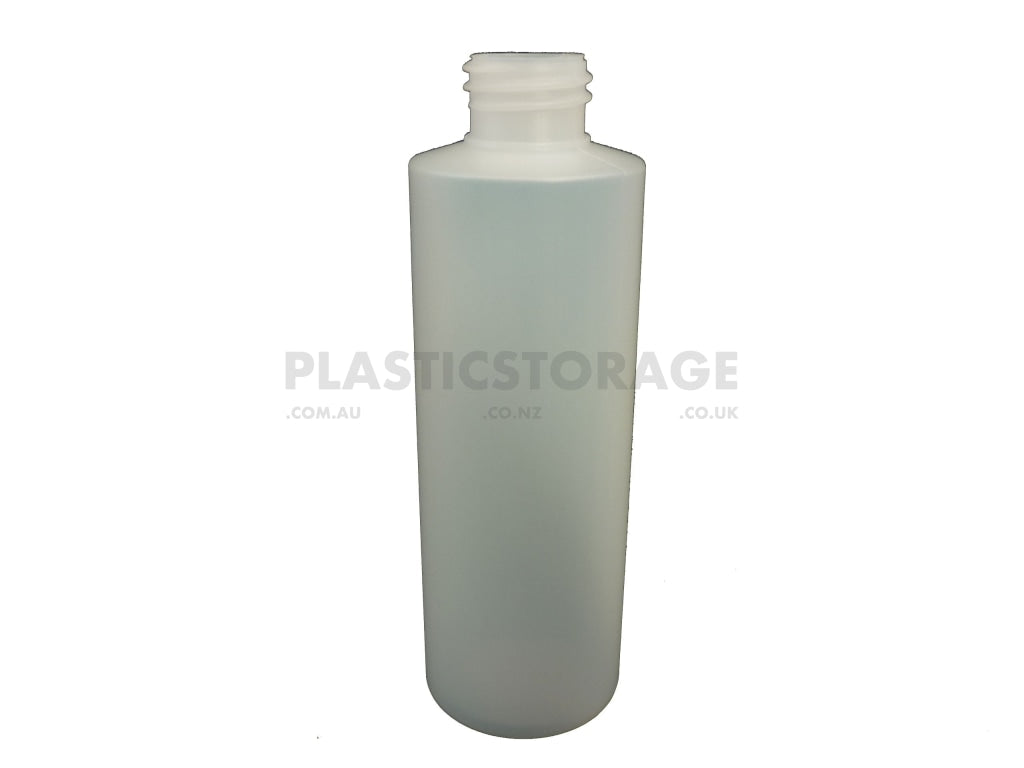 250ML Round plastic bottle with 28mm neck made from food grade HDPE. Perfect for liquid and chemical packaging.